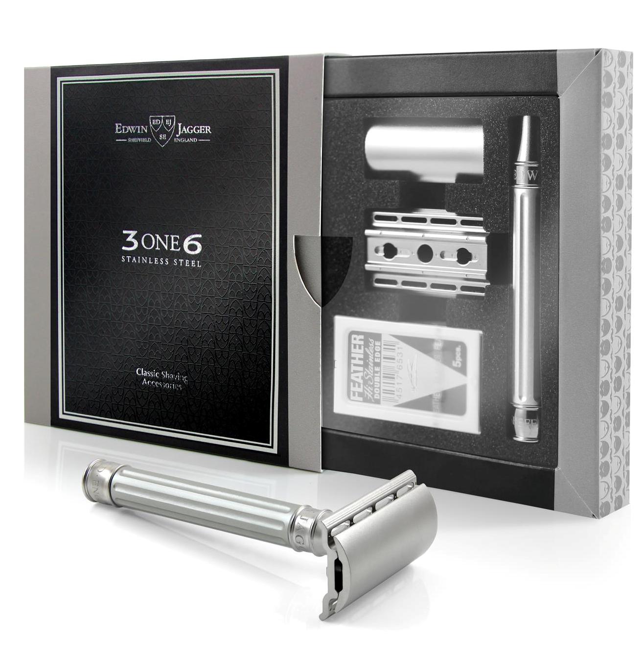Edwin Jagger 3ONE6 Klasik Tıraş Makinesi orta agresiflikte, akıcı bir tıraş veren ağırlığı, dengesi ve dayanıklılığı ile dikkat çeken bir tıraş aletidir. Bu modellerin en önemli özelliği makine başlığın 316 kalite paslanmaz çelikten imal edilmiş olmasıdır. Sap kısmı ise, siyah renkli olarak eloksal kaplamalı havacılık sınıfı alüminyum olarak üretilmiştir.