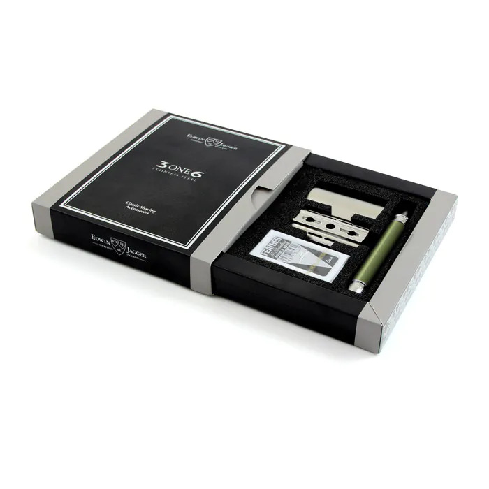 Edwin Jagger 3ONE6 Klasik Tıraş Aleti orta agresiflikte, akıcı bir tıraş veren ağırlığı, dengesi ve dayanıklılığı ile dikkat çeken bir tıraş aletidir. Bu modellerin en önemli özelliği makine başlığın 316 kalite paslanmaz çelikten imal edilmiş olmasıdır. Sap kısmı ise, haki renkli olarak yüksek kaliteli reçineden üretilmiştir.