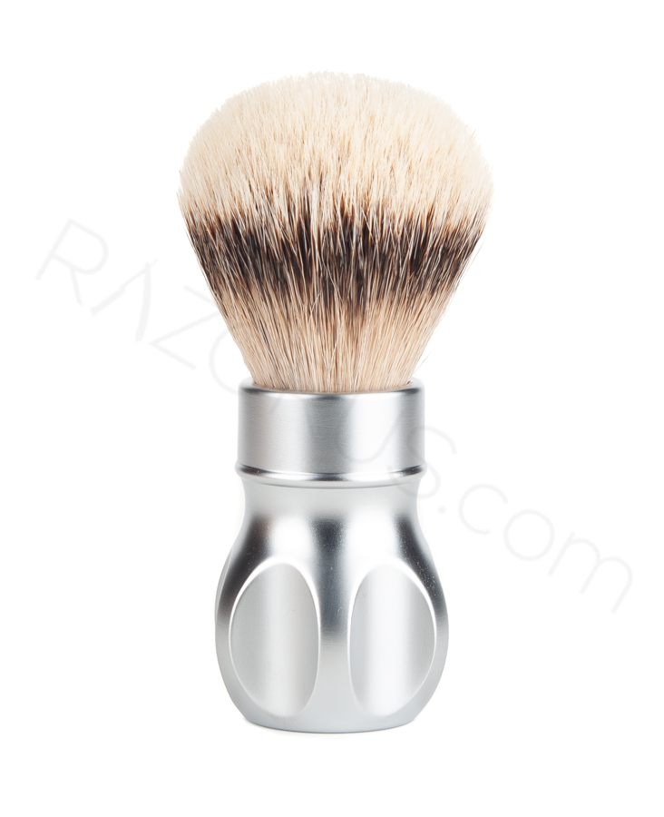 Yaqi Gemini Silvertip Badger tıraş fırçası 24 mm çapında, omurgalı, dolgun, masaj etkili, ancak aynı zamanda son derece yumuşak ve konforlu bir deneyim sunan en yüksek kalite silvertip porsuk kıllara sahip, mat krom kaplamalı, metal saplı bir tıraş fırçasıdır.